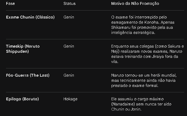 Diferente de outros Shonens onde o protagonista sobe de patente gradualmente, Naruto é o maior exemplo de que poder destrutivo não equivale a cargo administrativo. A patente Chunin exige habilidades de liderança, estratégia e discernimento tático para guiar uma equipe, competências que Naruto só demonstrou plenamente após a Quarta Guerra Ninja.